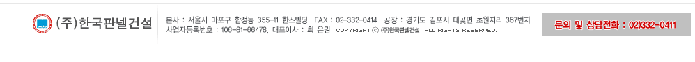 | 한국판넬건설의 S.G.P 및 동등이상의 제품으로서 설계도면에 기준한 것으로 사전에 각 부분별로 도면을 만들어서 시공 계획서와 함께 제출하여 발주자의 승인을 얻은후 시공한다. 두께는 66mm 를 기준으로 하고 그 이상의 규격은 상호협의하여 작업한다. |